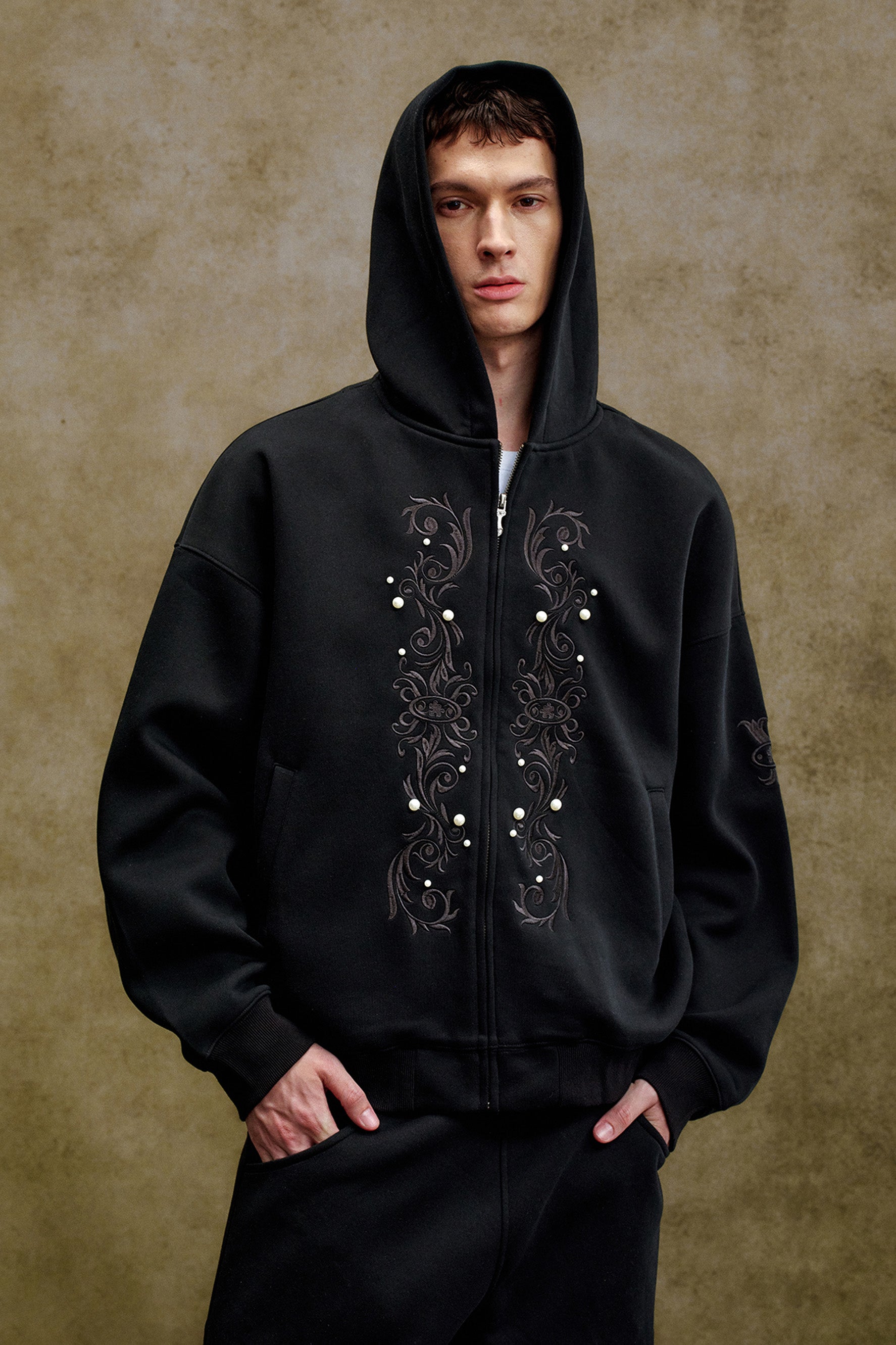 The YADCREW Pearl Hoodie combines the comfort of organic cotton with the durability of polyester for a soft yet resilient wear. Featuring elegant pearl embroidery on the front, this hoodie adds a refined touch to casual wear. Its zip-up closure offers easy layering, while two side pockets provide practical storage. This expertly crafted piece balances style with functionality for a sophisticated wardrobe staple.