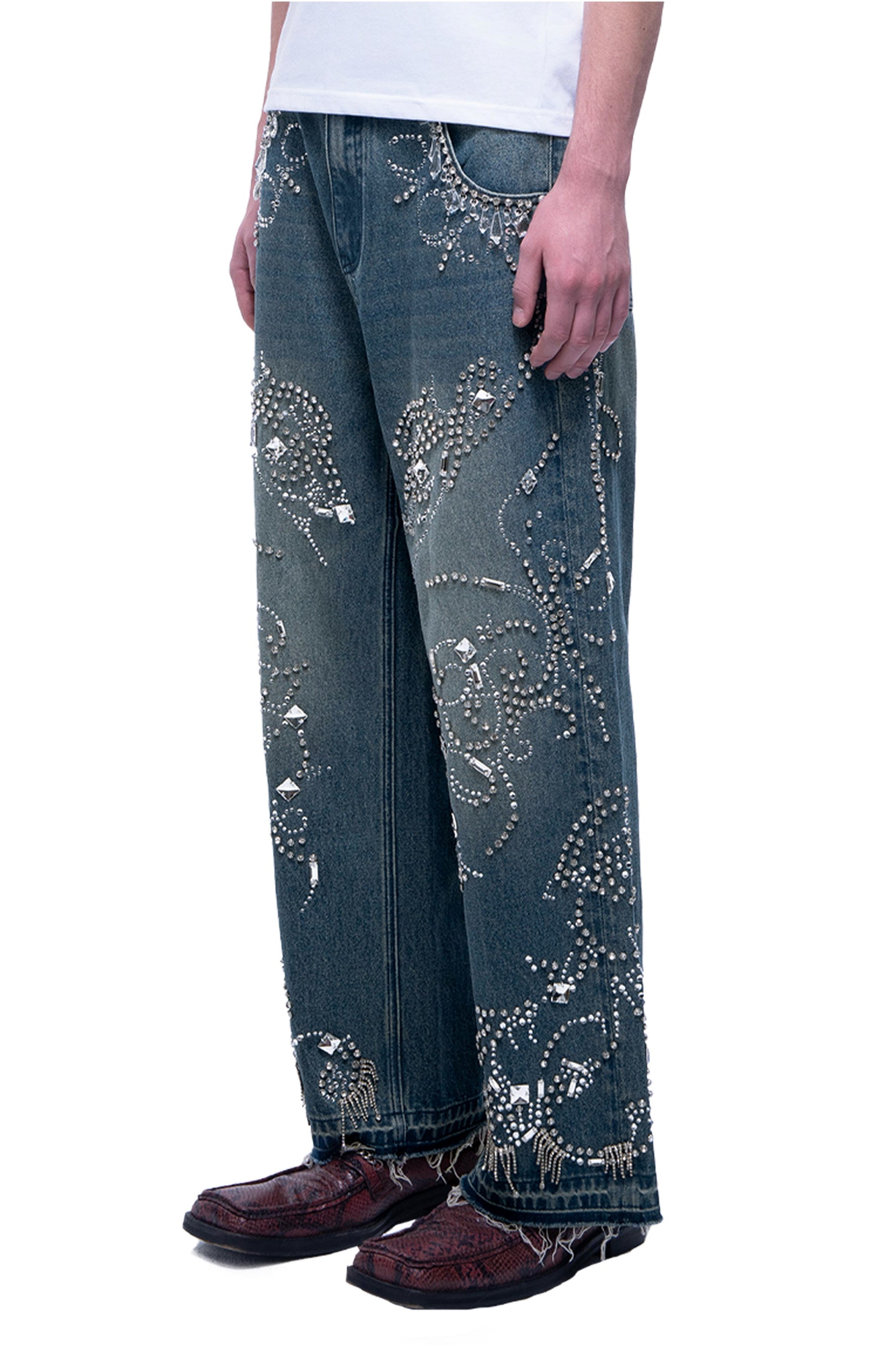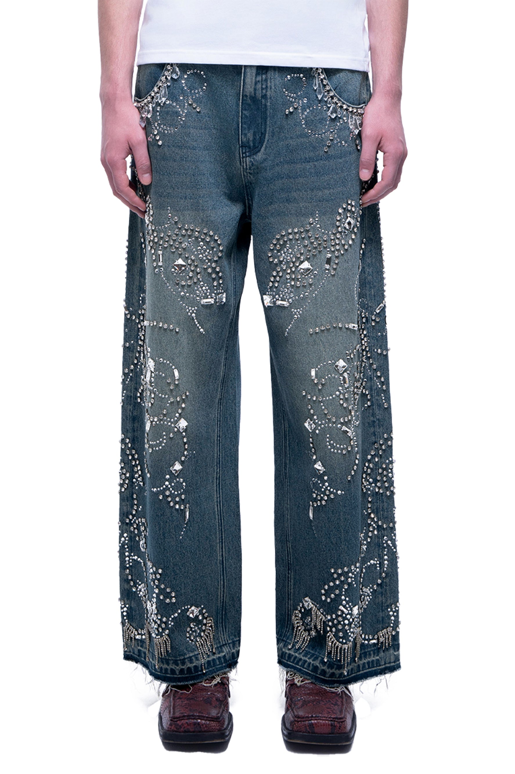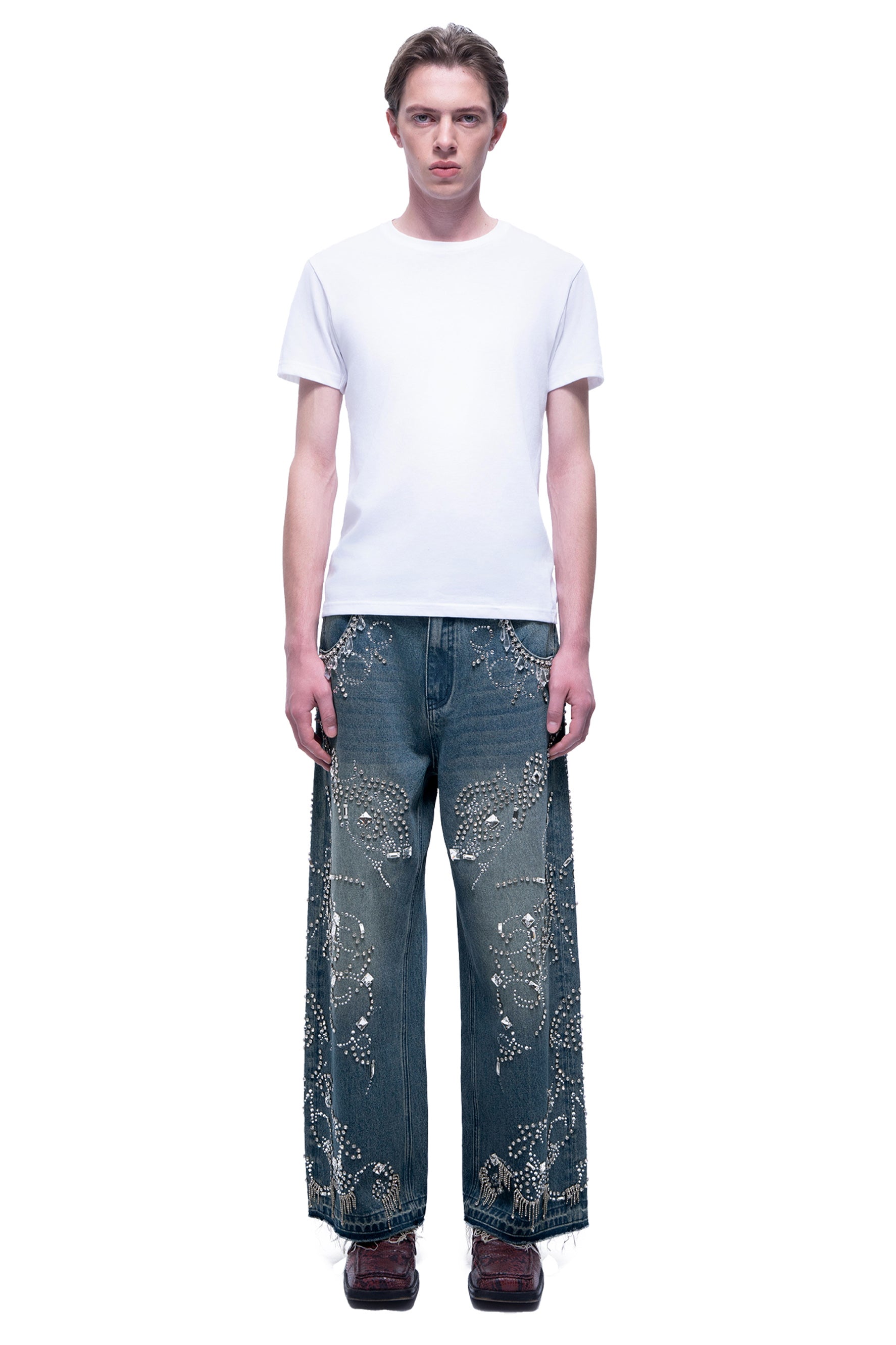 TBHNP Luminous Dawn Jeans showcase refined craftsmanship through a thoughtfully engineered fabric blend of cotton, regenerated cellulose fibre, and polyester. The vintage wash foundation pairs seamlessly with an intricate monkey pattern, while meticulously hand-sewn rhinestone accents and strategically placed heat-pressed stones elevate the front panel. The signature cat's whisker texture delivers authentic denim character, complemented by industrial-grade custom metal workwear buttons and rivets at the placket. These jeans represent a sophisticated fusion of heritage denim aesthetics and contemporary embellishment techniques, ideal for discerning wearers who value both substance and visual impact.