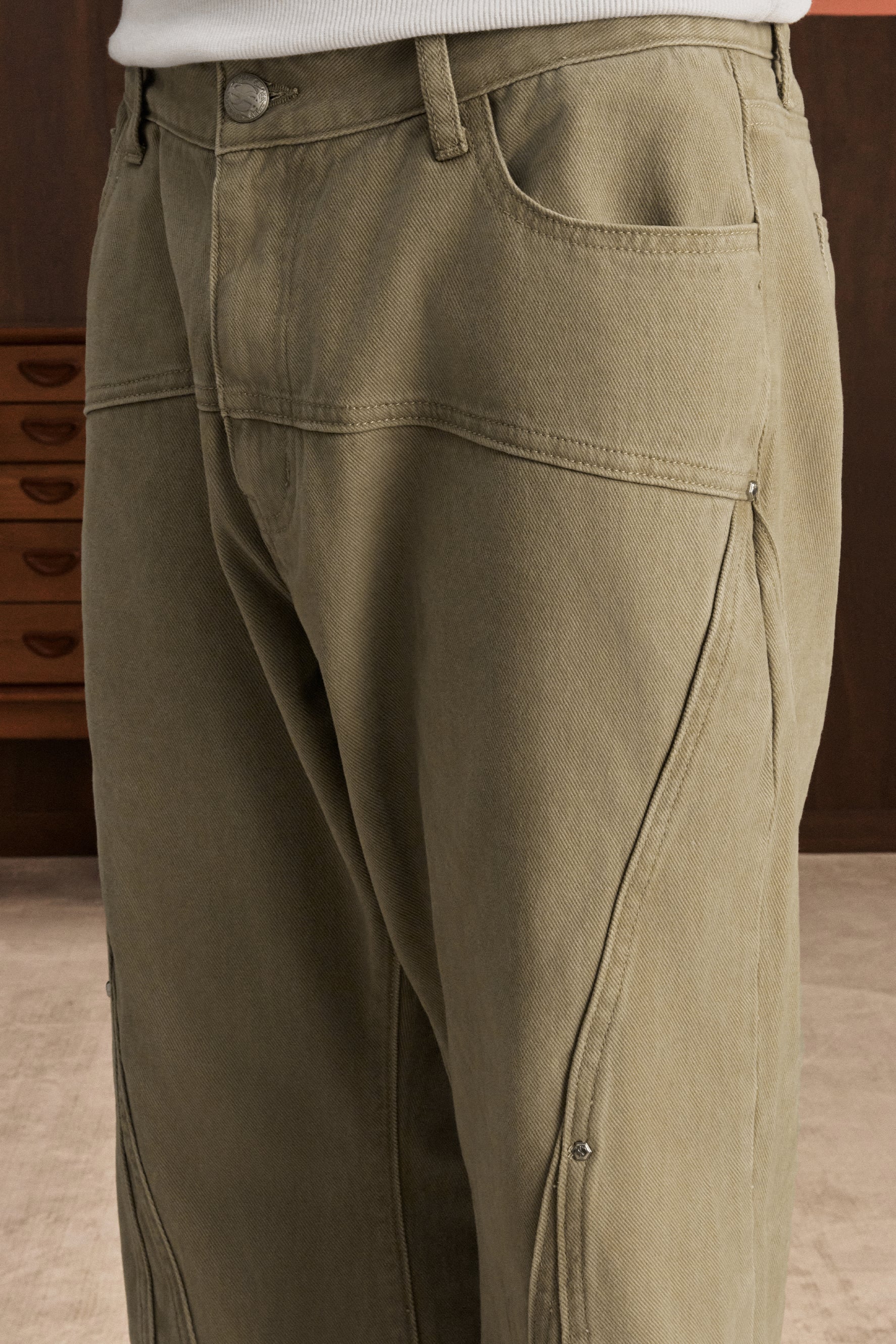 STK FLARED DECONSTRUCTED PANTS Crafted from premium 330g/m² heavy cotton, these deconstructed pants deliver substantial weight and durability. The slightly flared silhouette creates a contemporary, relaxed aesthetic while maintaining structural integrity. Functional design includes two front and back pockets for practical everyday wear. The loose fit accommodates layering and movement without compromising the garment's refined construction. Ideal for those seeking elevated basics with architectural tailoring.