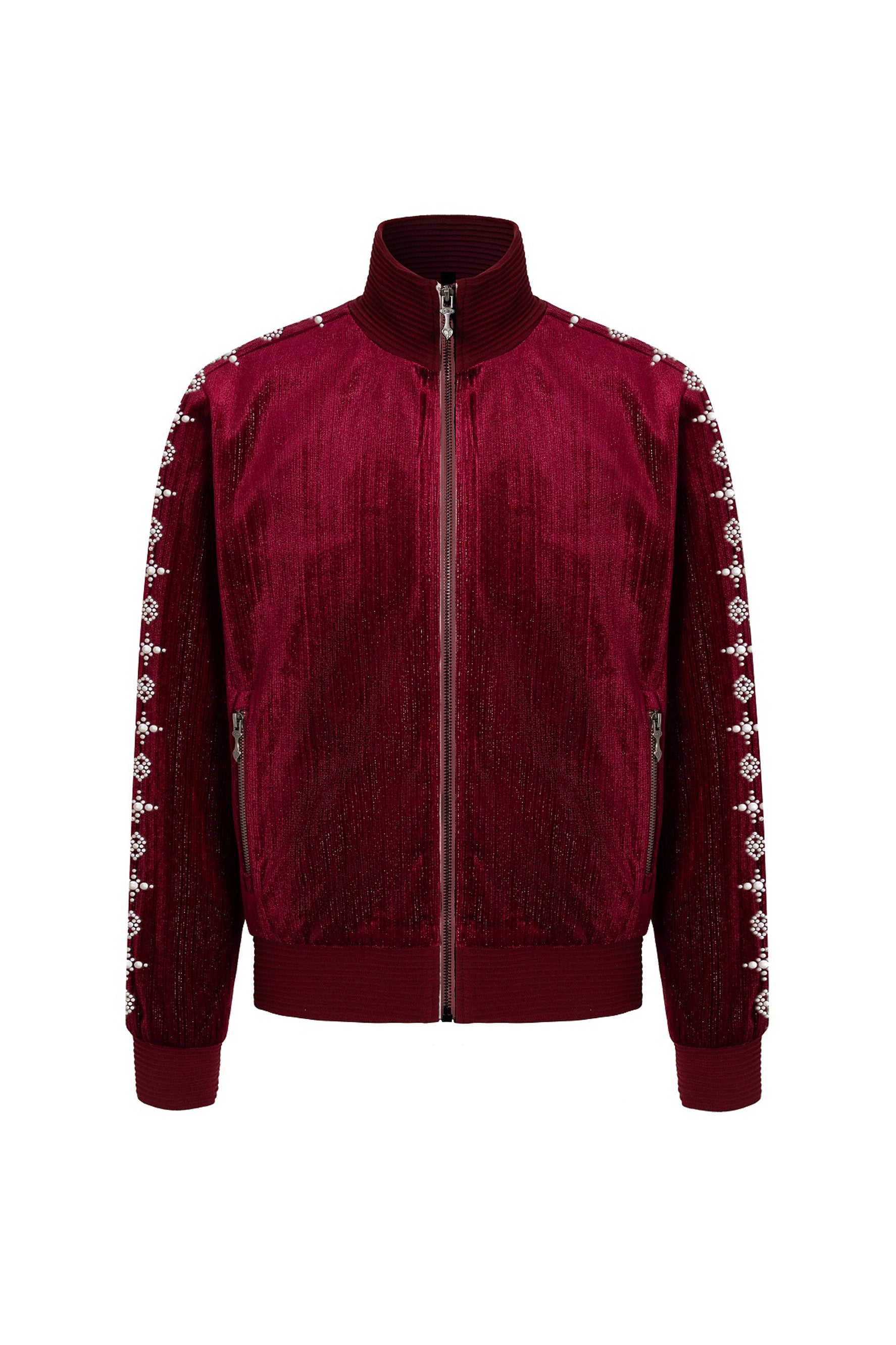 This sophisticated velvet jacket combines luxurious texture with refined detailing. The pearl embellishments adorning both sleeves add an elegant focal point, while the convenient zip-up closure ensures effortless styling. Elastic ribbed collar and hem provide a tailored fit that moves with you, and dual side pockets offer practical functionality. Crafted from durable polyester, this piece transitions seamlessly from casual to elevated occasions.