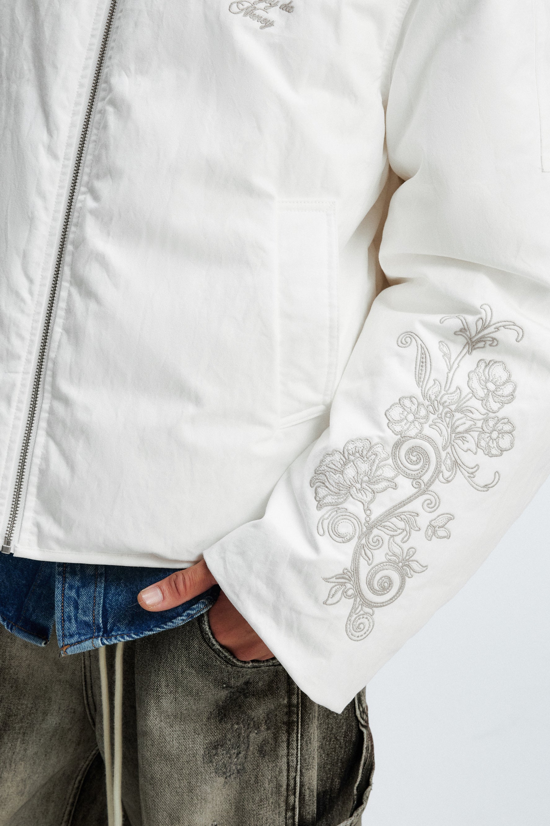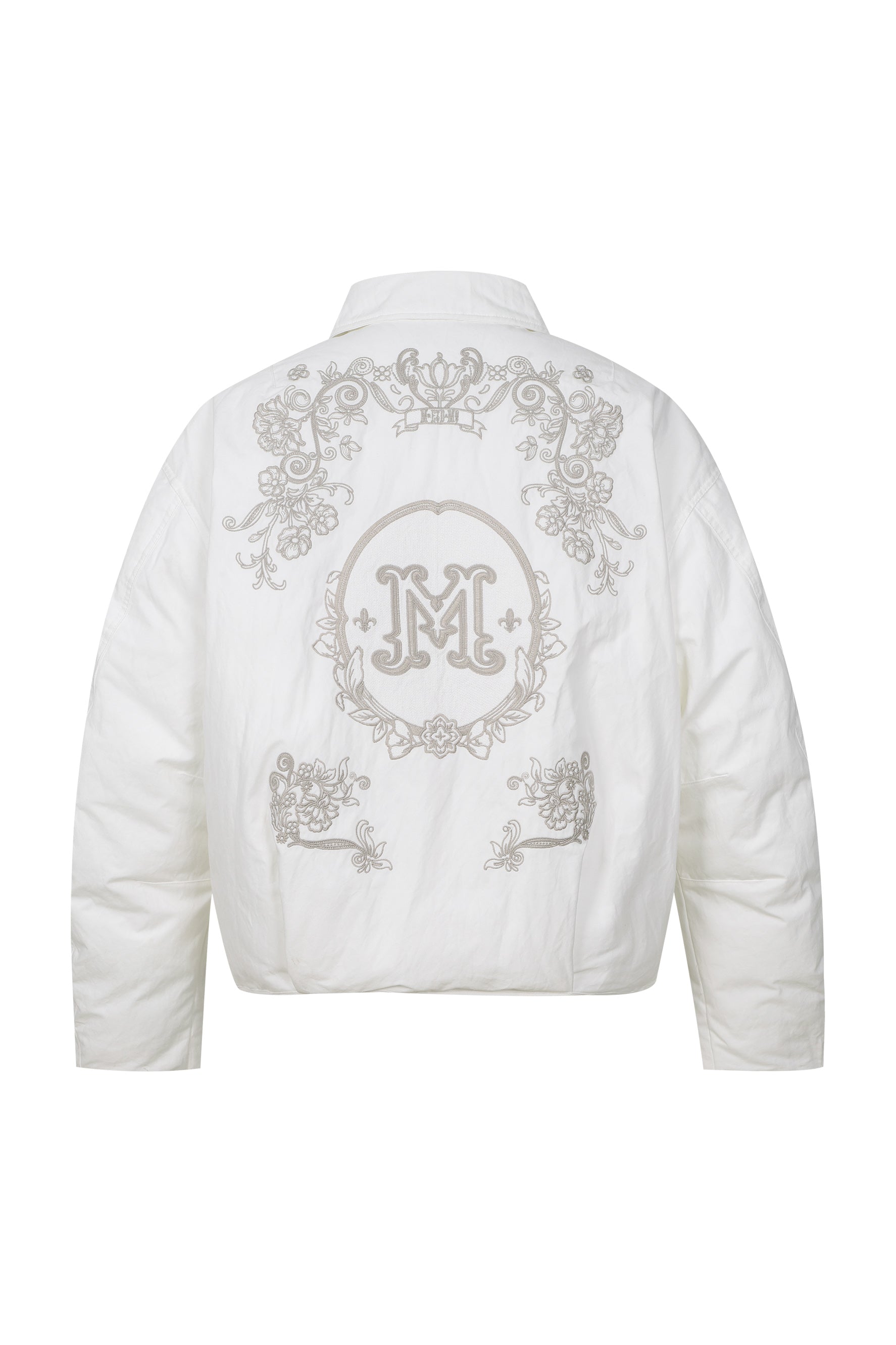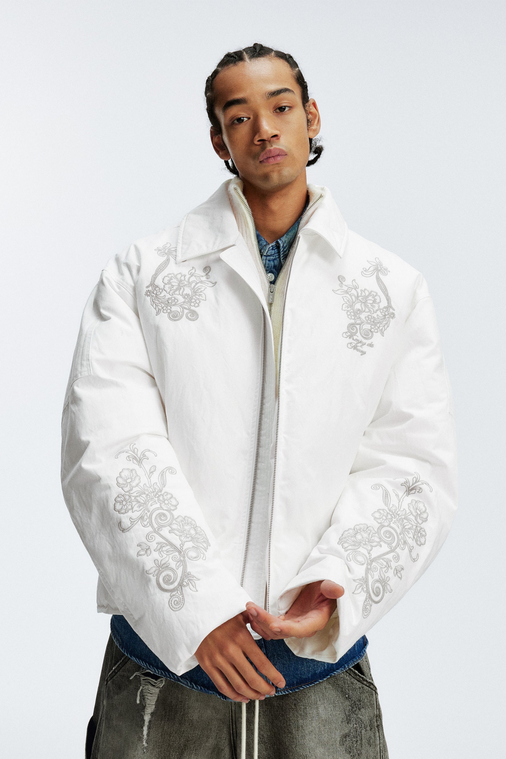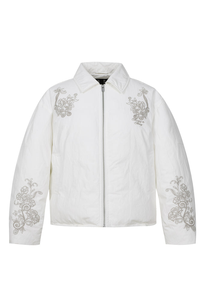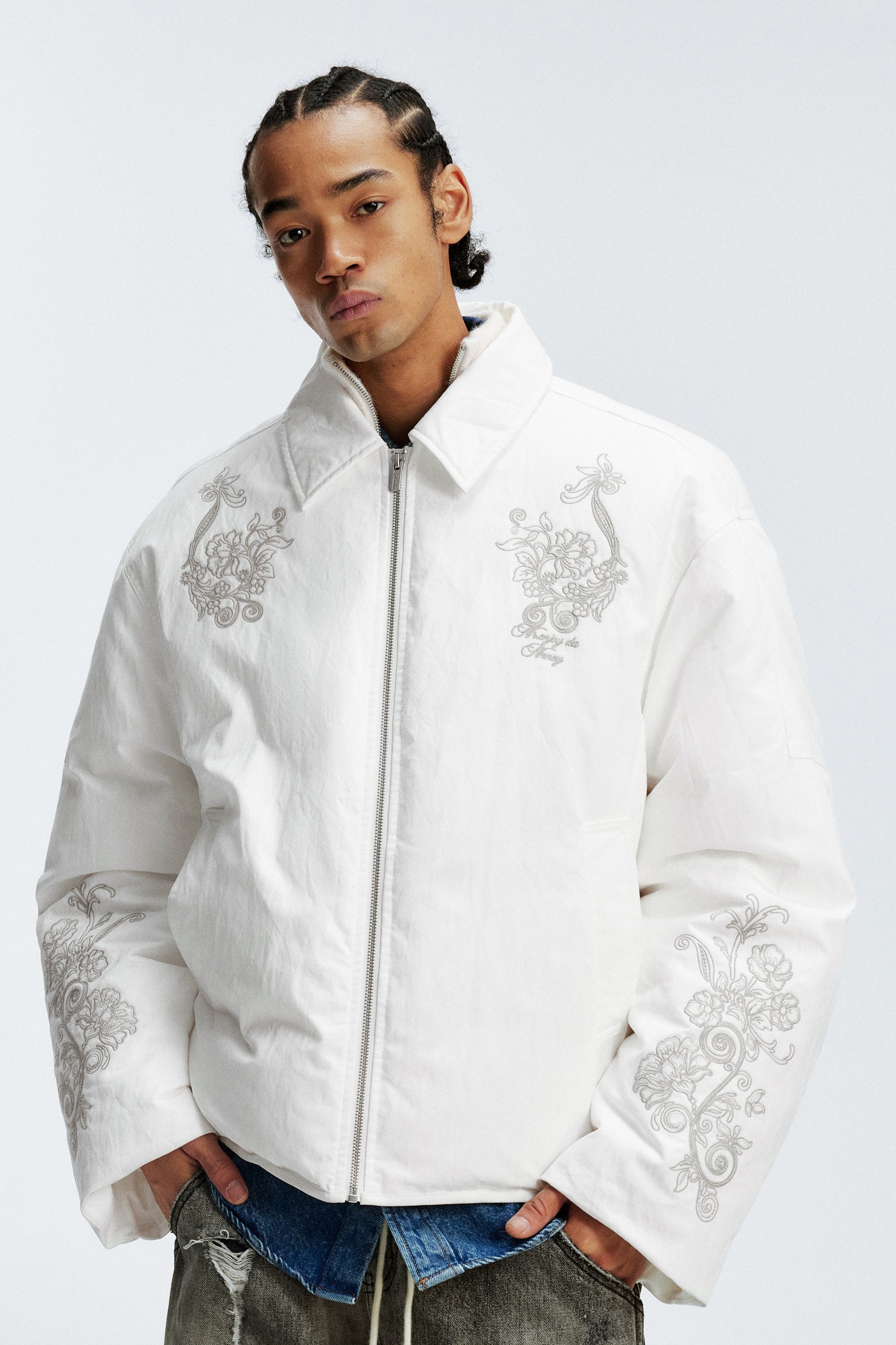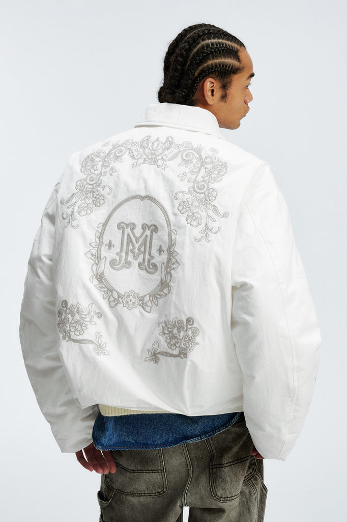 MEDM EMBROIDERED PATTERN JACKET This sophisticated jacket combines cotton and nylon for optimal durability and comfort. The intricate embroidered pattern adorns the entire piece, delivering distinctive visual appeal with refined craftsmanship. A secure zip-up closure ensures effortless layering and adjustable fit. Ideal for those seeking a statement piece that balances contemporary design with timeless elegance.